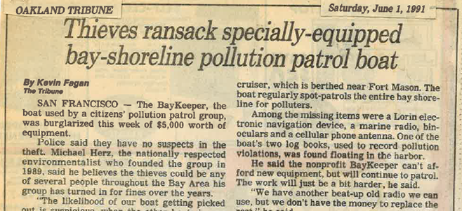 Less than a week later, the Baykeeper boat was broken into, several expensive pieces of electronic navigational gear were taken, and all of our patrol records were dumped overboard. Although we had no proof, we suspected this was retaliation for our having discovered and reported the shipyard’s illegal activities. We contacted both the police and the media, who once again publicized the story.