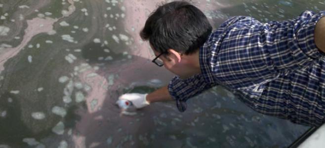 Geoff Potter, our volunteer skipper that day, maneuvered closer. We rocked slightly on low waves. Baykeeper staff scientist Ian Wren hung over the boat’s side as he reached down and scooped up samples of the polluted water for analysis at a lab.