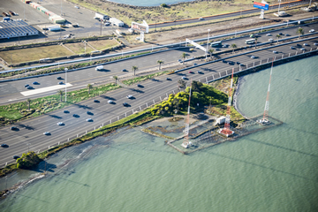 Photo of Bay Bridge approach durng the year's highest tides by Robb Most.
