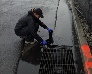 When rain started falling, Baykeeper staff members and volunteers went to the perimeter of the selected industrial facilities with laboratory-grade plastic bottles to fill with rainwater running off the site. If we succeeded in collecting a sample of the polluted runoff water, we took the bottles to a certified lab for testing.