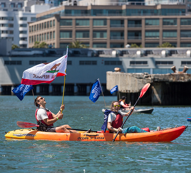 Costumes, noisemakers, and musical instruments are encouraged! Everyone will come together for the spectacular Bay Parade finale in McCovey Cove. We’ll raise a big banner showing our love for San Francisco Bay. And the finale will be broadcast on the ballpark Jumbotron at the start of the Giants’ home game.