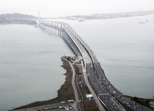 The Highway 80 East Bay approach to the Bay Bridge during the year’s highest tides. Most nearby land is underwater, with only a small strip of land between the highway and the Bay visible.
