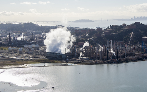 San Francisco Bay washed onto the grounds of the Chevron oil refinery in Richmond during king tides. When the tide ebbed, the water washed back into the Bay. As rising sea levels reach shoreline industrial facilities and sewage treatment plants, the risk of pollution washing into the Bay increases significantly.