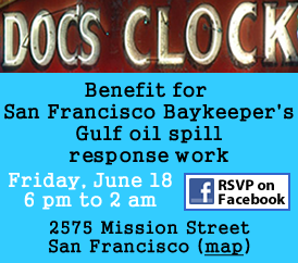 Next Friday, Doc's Clock will host a fundraiser to benefit San Francisco Baykeeper's work to help respond to the Gulf oil spill. 100% of the proceeds from the sale of certain beers will be donated to Baykeeper.