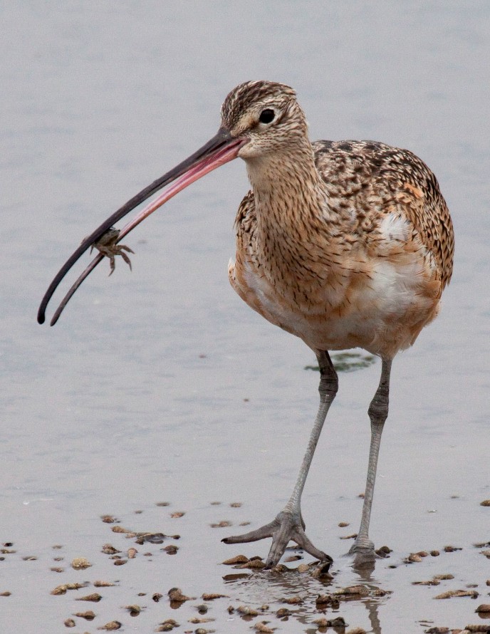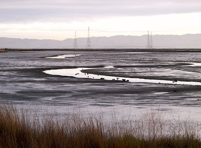 Mudflats, tidally exposed expanses of mud, connect the Bay’s marshes to submerged habitats. Mudflat habitat is a valuable part of the greater San Francisco Bay ecosystem, cycling nutrients, supplying sediment to marshes, and supporting animals above and below the water’s surface (Subtidal Habitat Goals Project). Marsh birds regularly forage on mudflats at low tide, searching for burrowing invertebrate animals like worms, amphipods, clams, snails, and crabs. At high tide, fish, diving ducks, bat rays, skates, and sharks also hunt for food on the surface of submerged mudflats. As water levels rise in the Bay, many lowland marsh areas will gradually lose their vegetation and transform into intertidal mudflats (Stralberg et al. 2011). Despite predictions that Bay mudflat areas will increase in size over the next century, the effects of sea level rise in the Bay threaten this crucial habitat (Stralberg et al. 2011).